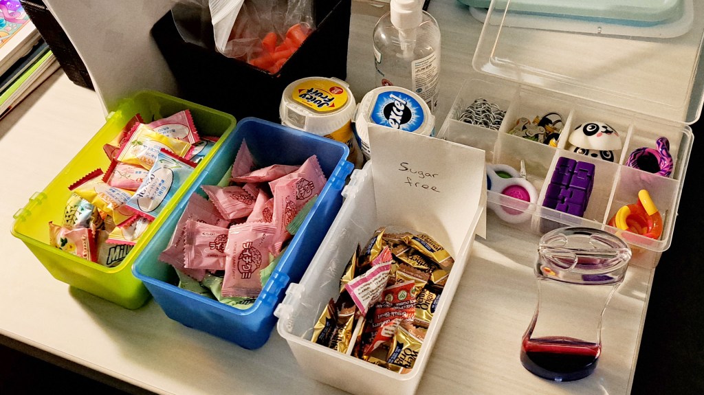 We have a variety of fidgets and toys for different types of stimming including visual, tactile, kinetic, and oral (gum and candy).